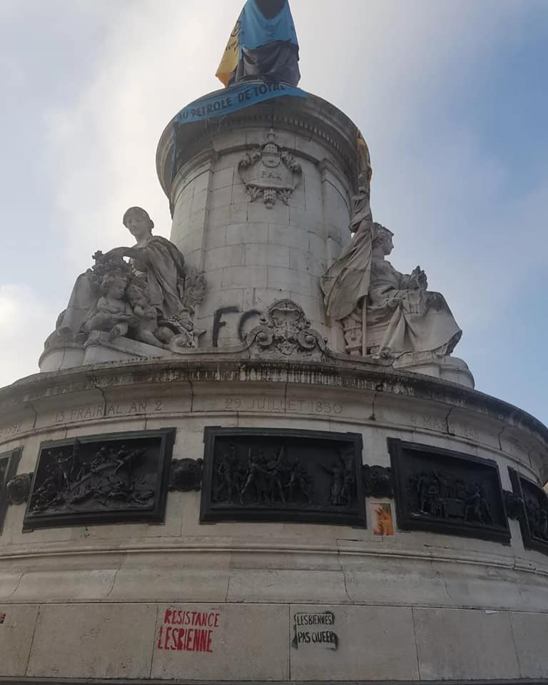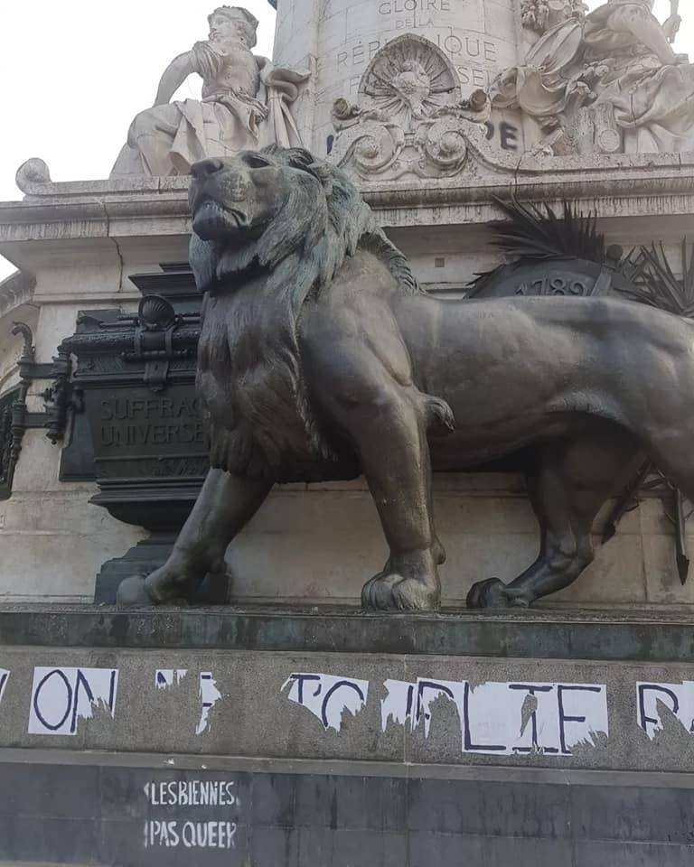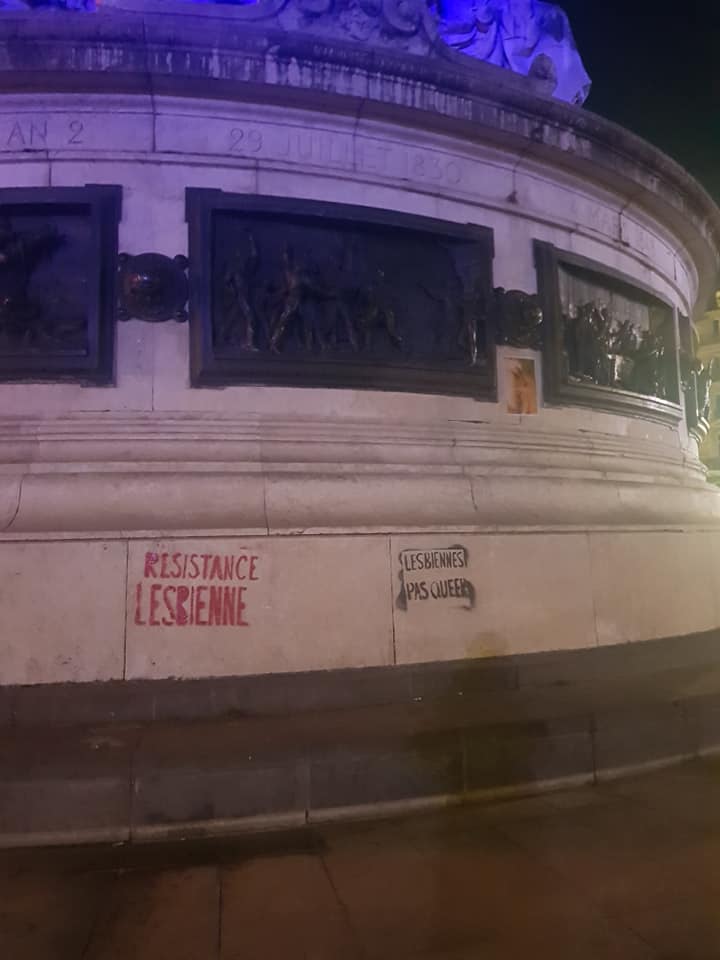 Le 8 mars, noues étions physiquement agressées à Place de la République pendant la manif féministe. Aujourd’hui, le lieu est réapproprié, au moins temporairement, avec nos slogans « Lesbiennes pas queer » et « Résistance Lesbienne »
