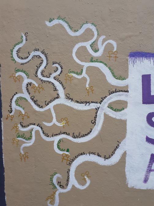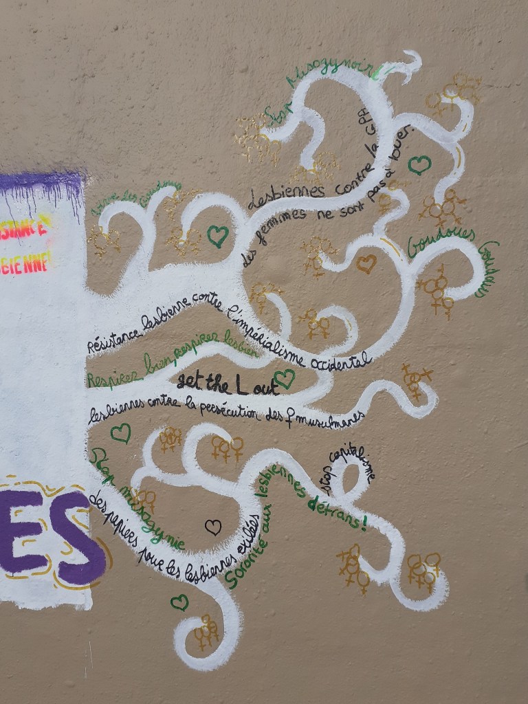 Vive les Goudous »/ »Stop Misogynoir »/ »Lesbiennes contre la GPA. Les femmes ne sont pas à louer »/ »Résistance Lesbienne contre l’impérialisme occidental »/ »Respirez bien, respirez lesbien »/ »Get The L Out »/ »Lesbiennes contre la persécution des femmes musulmanes »/ »Stop misogynie »/ »Stop capitalisme »/ »Des papiers pour les lesbiennes exilées »/ »Sororité aux lesbiennes détrans »