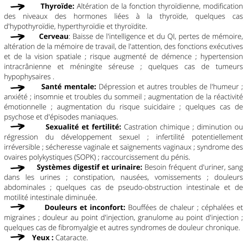 Des preuves substantielles provenant d’études scientifiques évaluées par des pairs, des études de cas et des essais cliniques suggèrent que les bloqueurs de puberté peuvent affecter négativement le squelette, le système cardiovasculaire, la thyroïde, le cerveau, les organes génitaux, le système reproducteur, le système digestif, le système urinaire, les muscles, les yeux et le système immunitaire. Les préoccupations particulièrement urgentes pour les adolescents traités avec des médicaments bloquant la puberté sont la perte de densité minérale osseuse et le risque accru d’ostéoporose, une potentielle diminution du QI et d’autres déficits cognitifs, un risque accru de dépression et de pensées suicidaires, un retard de développement sexuel et reproductif. Les données suggèrent que bon nombre de ces effets sont totalement ou partiellement irréversibles.