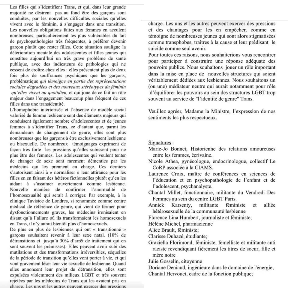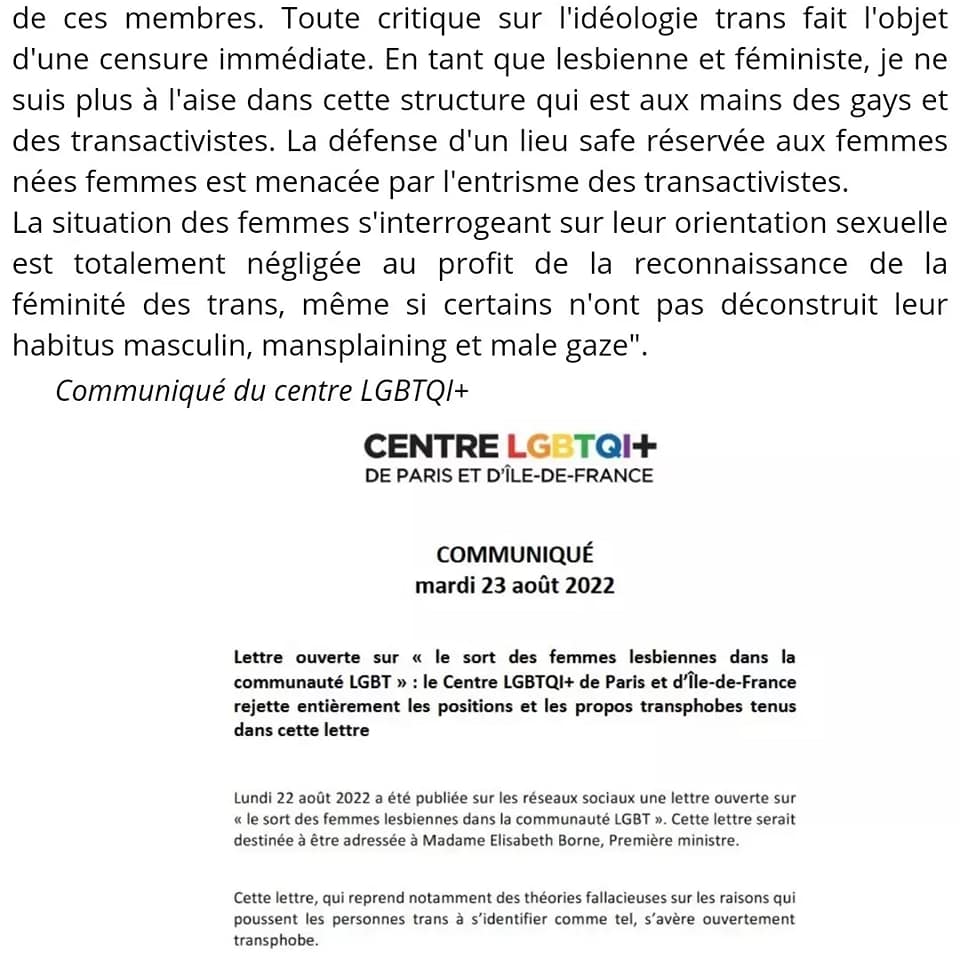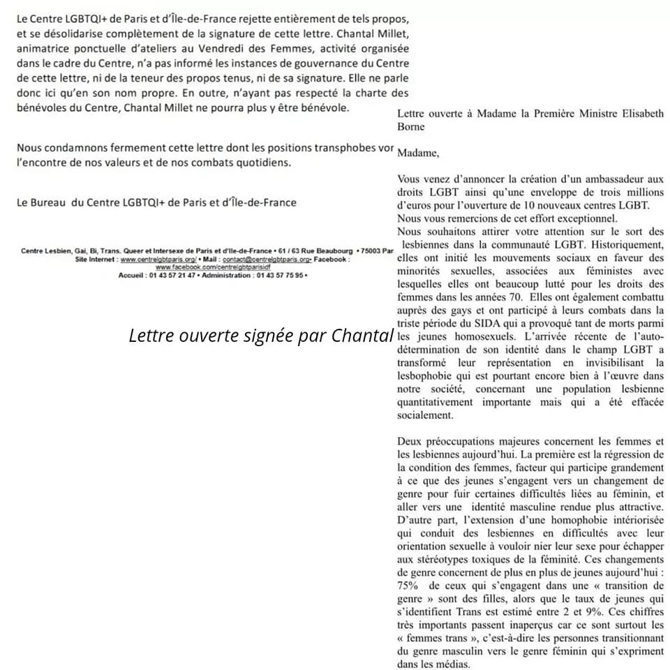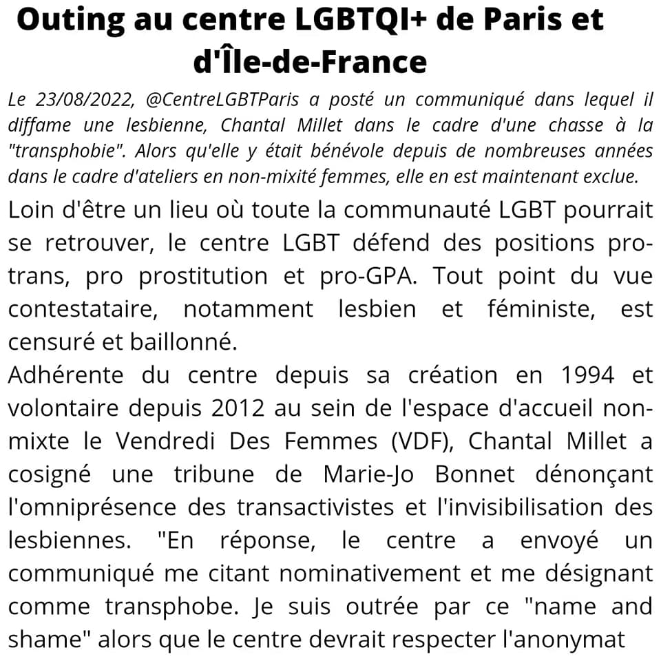 Adhérente du centre depuis sa création en 1994 et volontaire depuis 2012 au sein de l’espace d’accueil non-mixte le Vendredi Des Femmes (VDF), Chantal Millet a cosigné une tribune de Marie-Jo Bonnet dénonçant l’omniprésence des transactivistes et l’invisibilisation des lesbiennes. « En réponse, le centre a envoyé un communiqué me citant nominativement et me désignant comme transphobe. Je suis outrée par ce « name and shame » alors que le centre devrait respecter l’anonymat de ces membres. Toute critique sur l’idéologie trans fait l’objet d’une censure immédiate. En tant que lesbienne et féministe, je ne suis plus à l’aise dans cette structure qui est aux mains des gays et des transactivistes. La défense d’un lieu safe réservée aux femmes nées femmes est menacée par l’entrisme des transactivistes. La situation des femmes s’interrogeant sur leur orientation sexuelle est totalement négligée au profit de la reconnaissance de la féminité des trans, même si certains n’ont pas déconstruit leur habitus masculin, mansplaining et male gaze ».