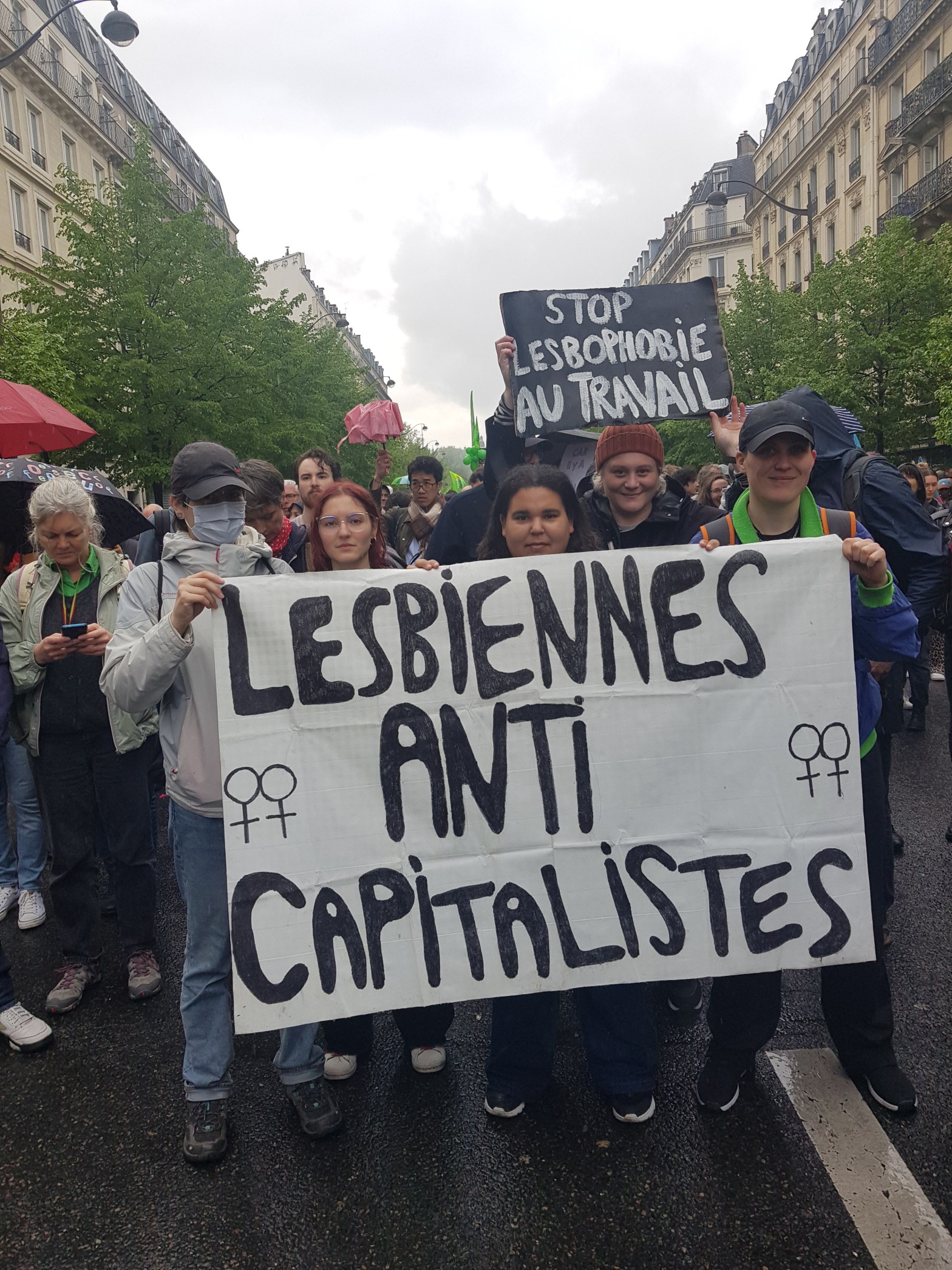 Noues étions présentes à la manif du 1er mai à Paris, en soutien à toutes les lesbiennes travailleuses et exploitées! Noues avions pancarte « Stop Lesbophobie au Travail » et une banderole « Lesbiennes Anticapitalistes »